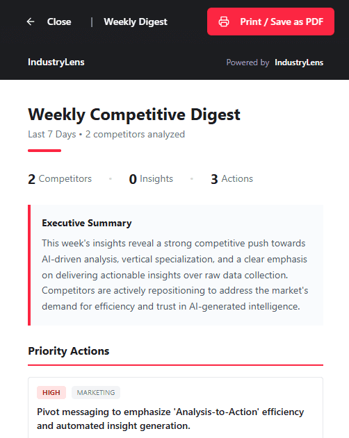 Every week, IndustryLens synthesises activity across your competitive landscape into clear recommendations that help teams decide what to do next.