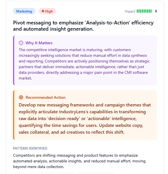 IndustryLens goes beyond reporting changes. It generates strategic recommendations based on patterns across your competitive landscape.