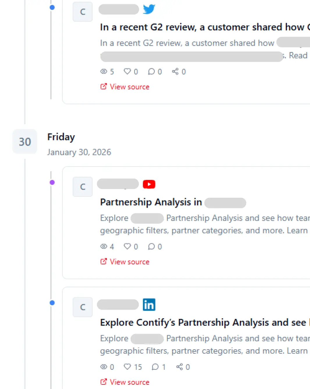 Track competitor activity across LinkedIn, Instagram, Facebook, X, and YouTube. See what topics they are investing in, which posts get engagement, and how their content strategy is evolving. Stop guessing what competitors are doing on social — see it all in one feed.